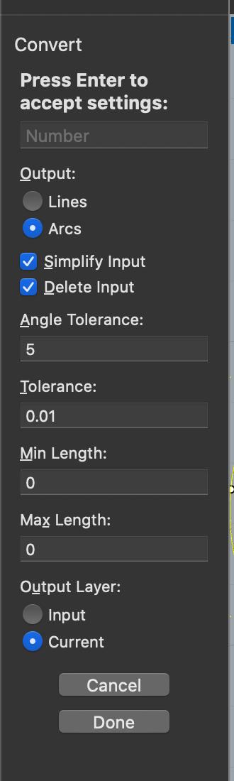 2. Find all "control point curves" and select them. Don't select any straight lines or circles. With only the curves selected, use Curve > Convert > Curve to Arcs as shown in the screenshots.