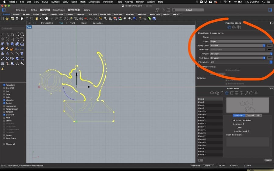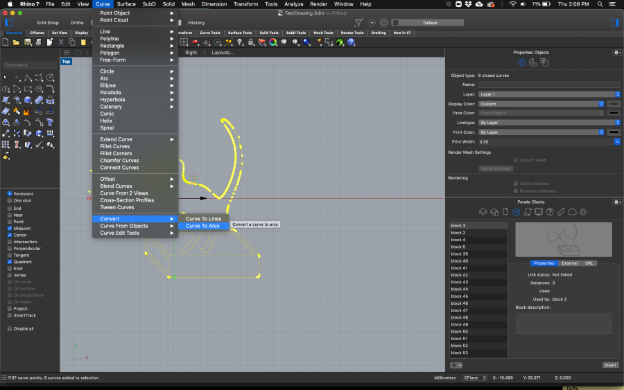- First, explode any "blocks" or "groups" you may have, until the objects are showing as curves.