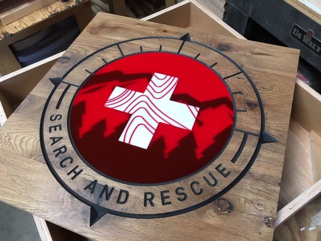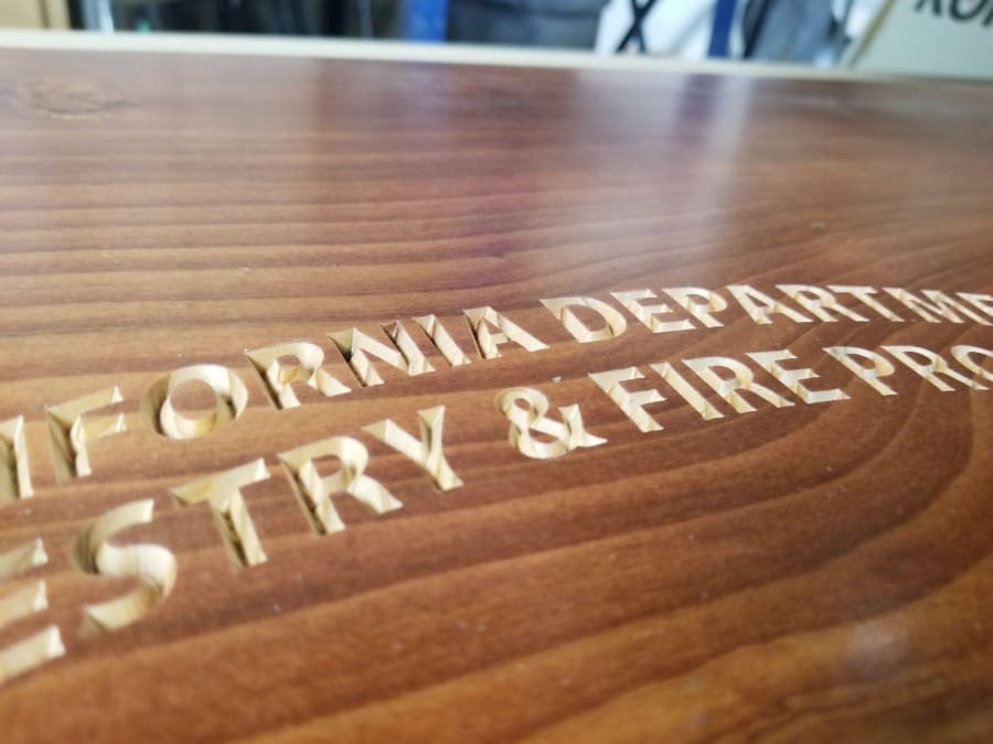 Posted on in unusual materialsEngraving lettering, logos, or other imagery into large wood slabs is something we are asked to do from time to time. Often the customer is planning to fill the engraving with resin for an inlaid look, or paint for contrast. We usually see conference tables, dining tables, plaques, and benches done with this treatment. It is also possible to combine engraving and inlays. In the piece shown below, we engraved the lettering and outlines, and inlaid two colors of acrylic as well as painting the engraved areas on both the wood and acrylic.