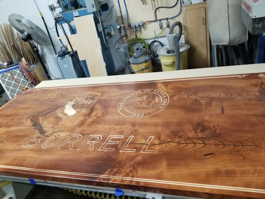 Depending on the specifics of the design to be engraved, we might use flat endmills, V bits, or ball nose bits. Often the cuts will be filled with resin so the important result is the edge of the cut. Other times the cuts will be painted on the inside, and we can mask the surface prior to cutting, if desired, to make the painting process easier. Sometimes, of course, the customer will do nothing further but put a finish on the slab to show off the inherent beauty of the wood itself, and the cuts in this case must be perfect, without tearing or raggedness on the interiors.
